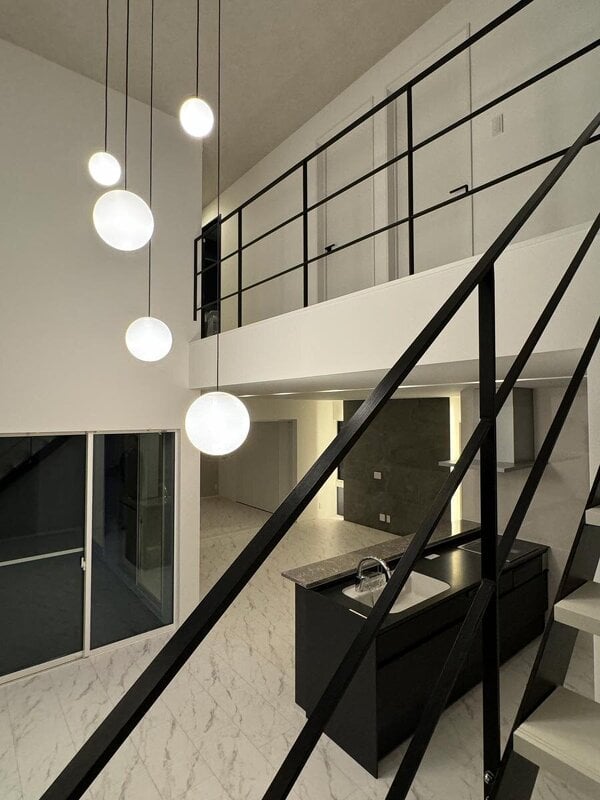 吹き抜けの天井から吊るしたペンダントライトも「こだわり」の一つ。