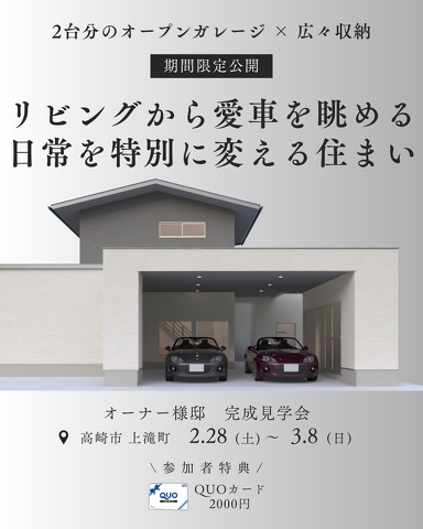 イベント2台分のオープンガレージ×広々収納 リビングから愛車を眺める日常を特別に変える住まい