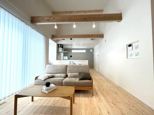 ・勾配天井と梁あらわしが特徴的なLDK