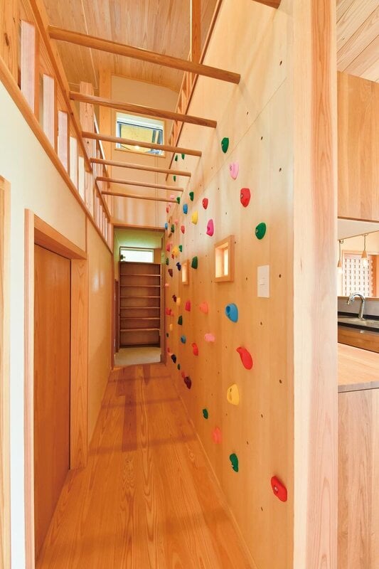 リビングの奥にはプレイコーナー、キッチンの裏には雲梯のあるアスレチックコーナー、ロフトにはハンモックを付けるなど、楽しい特徴。また、子供室は1.5階に設け、敢えて扉をつけずにリビングとのコミュニケーションを取りやすくし、床下はたっぷりの収納に。玄関や水廻りは、回遊式動線で使い勝手抜群!床には杉無垢材、壁は珪藻土を使用。