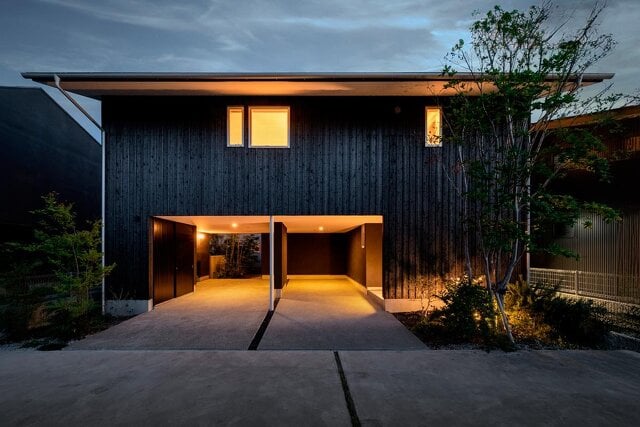 北側道路の敷地で、3方向を隣家に囲まれた住宅地。2階リビングにすることで車2台分のインナーガレージ、ダイニングからつながる半戸外のバルコニー、リビングからの視線の抜けも得ることができた。外壁には優れた耐久性と耐候性、耐火性を持ち、腐食や虫食いにも強い素材「焼杉」を使用。自然素材ならではの経年変化を楽しめる。