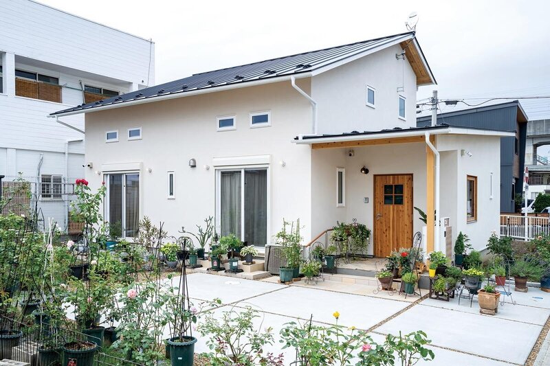奥様の大好きな薔薇の花が良く似合う、見た目にも優しいアイボリー色の塗り壁。花の手入れをしていると近所の方から「素敵なおうちですね」と声を掛けられる事が多いそう。