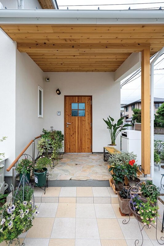 思わず心が弾む、客人をもてなすかのようなアプローチの先に見えるのは、風情あふれる木製断熱ドア。雨に濡れないほど深い軒も特長の一つ。