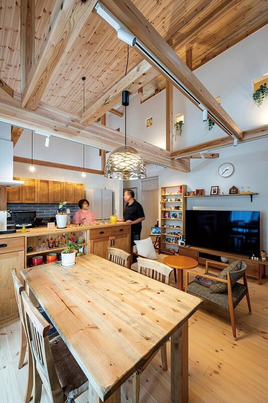 床と天井にあしらったパインの無垢材、ご家族のコミュニケーションを育むオリジナルダイニングテーブルに、お気に入りの雑貨をディスプレイしたキッチン対面の飾り棚。