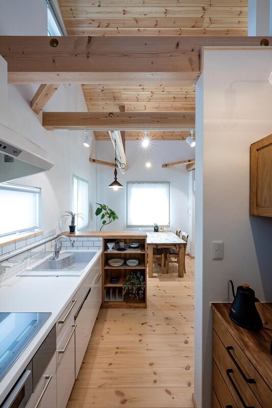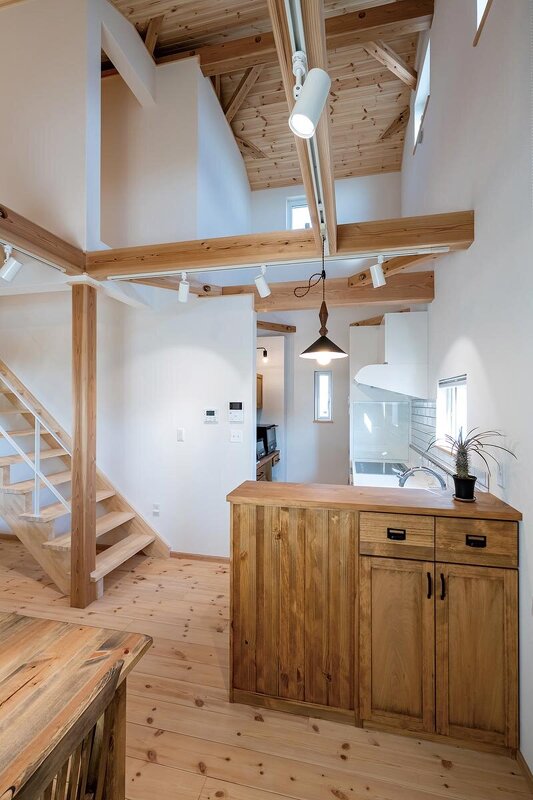 新築、平屋、延床面積30坪以下、長期優良住宅、耐震等級3、木製サッシ、熱交換換気、壁付けキッチン、吹き抜け、ロフト・小屋裏、造作家具・建具、大黒柱・梁の現し、自然素材をふんだんに使用、木造軸組工法
