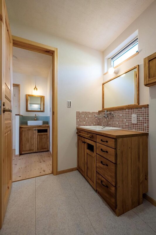 玄関に併設した手洗い台と、脱衣室に設けられた洗面台。色の異なるタイルでコーディネートしている。