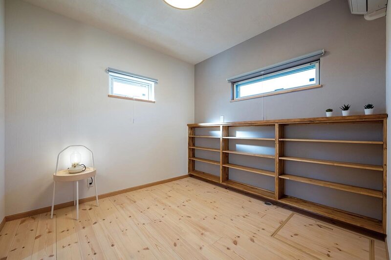 読書好きなFさんのために造作した、大容量の本棚が目を引く主寝室。玄関ホールと洗面スペースの双方から行き来できる。