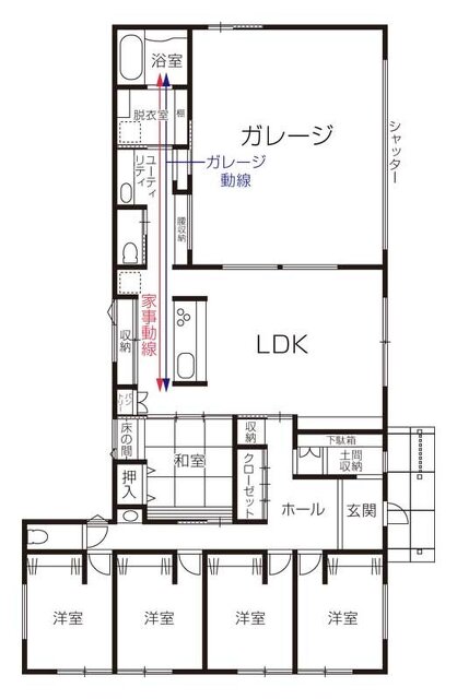 ガレージとつながるユーティリティ。身支度を整えて出かけたり、帰宅後すぐに浴室へ向かえたりと便利な配置だ。