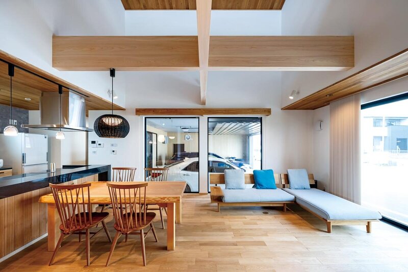 リビングからいつでも愛車が眺められる生活を希望していたKさん家族。他にも優れた性能や家事がしやすい動線、耐震性、健康にやさしい自然素材、和モダンな平屋など、こだわりたいポイントが多かった。IECOCOROをキッカケに横山建設と出会い、常に整った現場風景や丁寧な仕事ぶりに感銘を受け、依頼を決めた。