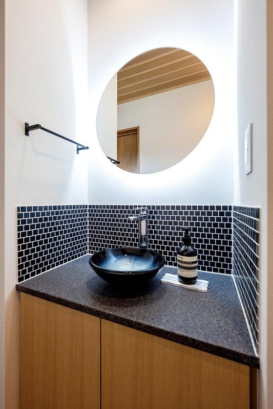 おしゃれな洗面ボウルが映える、素材を活かしたモダンなデザインの洗面化粧台。
