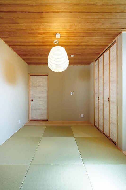 リビング横には和室を配置。ヒノキの床やラオス松の天井など、木の質感がここちいい。