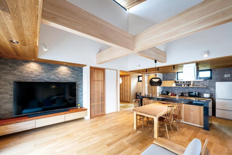 床材はナラ、天井はオークを採用。さらにテレビボードはカリン、ダイニングテーブルは杉など、造作家具にも自然素材を適材適所で組み込んだコーディネートとなっている。