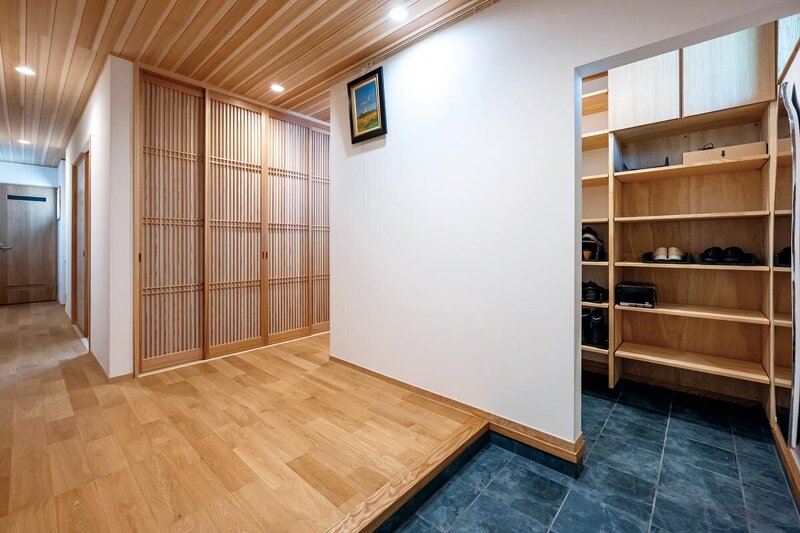 建具のデザインが美しい高級旅館のような玄関。断熱施工にこだわったため、玄関に入った瞬間からきもちいい。